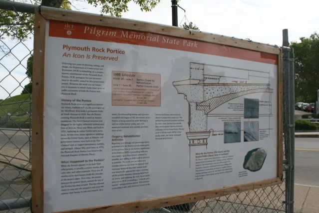 So, what’s happening is that they are repairing the portico that covers Plymouth Rock. It’s sort of darkly humorous that the portico was built in the neoclassical style to suggest permanence, stability and strength, and is falling apart. Perhaps, instead of a structure built to look like granite, but containing terra cotta tiles, mortar and other materials, it should have been built with say…granite? It’s just one of my crazy theories. I’m just throwing that out there.